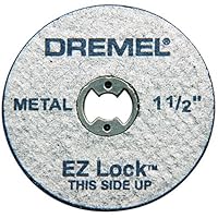 The Dremel 1-1/2-Inch EZ Lock Rotary Tool Cut-Off Wheels make it easy to cut through metal. These reinforced cut-off wheels last up to two times longer than typical fiberglass wheels. These wheels can be used for cutting metal conduit and PVC piping, reslotting screw heads, and removing rusty nail heads. The EZ Lock design makes changing accessories as easy as a pull, twist, and release, with no worry of losing a screw or needing a wrench. This pack includes five cut-off wheels.